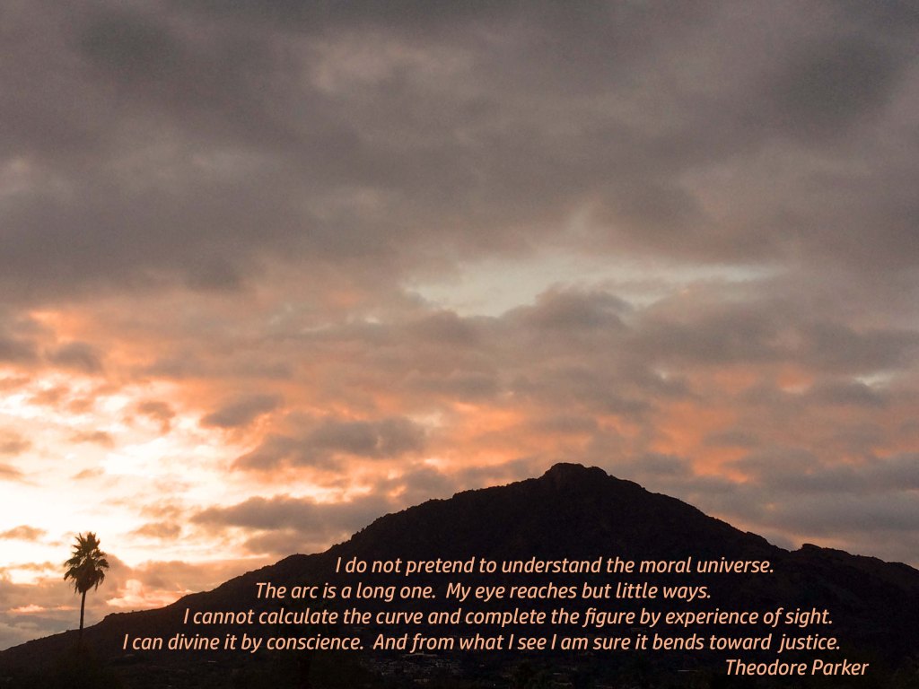 Photo taken in Phoenix a few years back. Text is the longer and original (1853) portion of a sermon by abolitionist minister Theodore Parker shortened by Martin Luther King, Jr. a century later to — “The arc of the moral universe is long, but it bends toward justice.” Long or short form, the concept is the same, and is true — but damn, I love those days where the “bends toward justice” part is most apparent, because sometimes it isn’t.