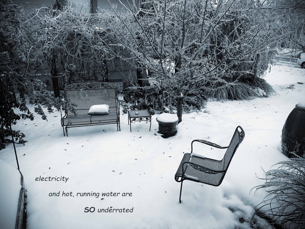 Haiku of the Week Posted on February 17, 2021 Photo taken off the front porch, day three of no electricity or hot water. Share this: Click to share on X (Opens in new window) X Click to share on Facebook (Opens in new window) Facebook Like Loading... Related