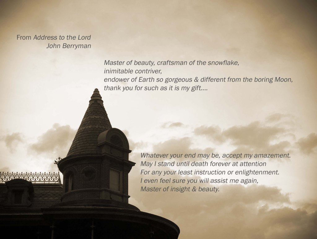 Photo taken on a run yesterday, the Littlefield Mansion on the University of Texas campus. Text from John Berryman’s Address to the Lord. See the whole poem at https://www.poetryfoundation.org/poems/48948/eleven-addresses-to-the-lord