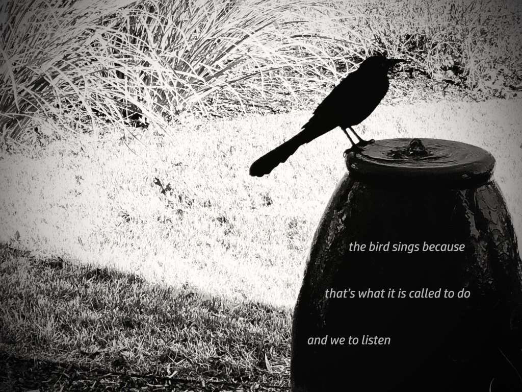 A “from the front door” view of the front yard fountain that also serves as a stage, bath and watering hole for the birds — particularly the noisy grackles.