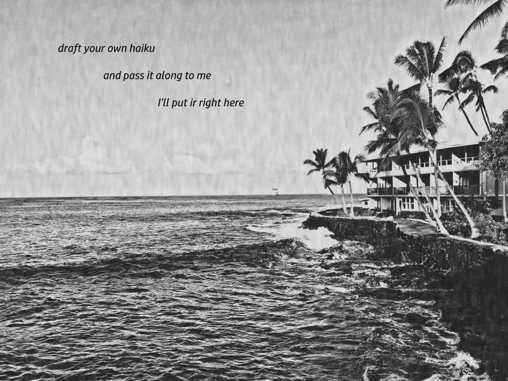 Provide your own haiku to me for this photo — 5 syllables, 7 syllables, 5 syllables — and I’ll put them on the photo and post them here.