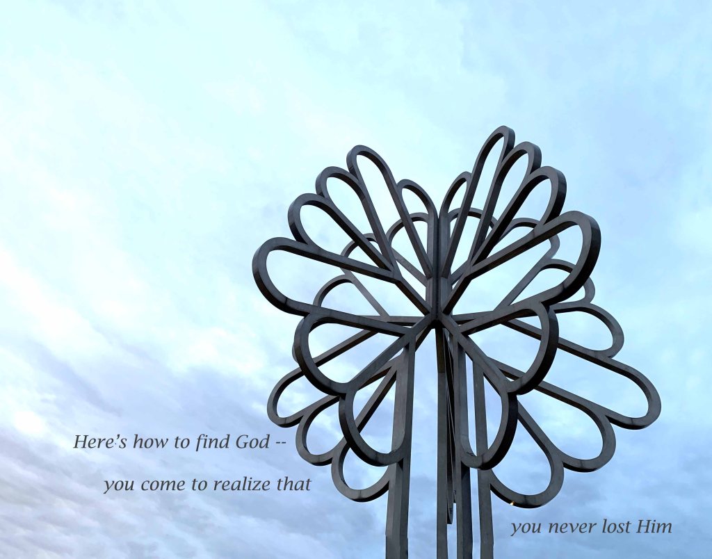 This thought filters through from Anthony DeMello’s One Minute Wisdom: We don’t need to put God in our lives so much as to recognize that he is already there. I am reminded of the bumper sticker – “If you find yourself distant from God, guess who moved.” Those sound a bit trite as I process them, but nonetheless true. The word that comes to mind here is “juxtaposition,” which Webster’s defines as “the act or an instance of placing two or more things side by side, often to compare or contrast or to create an interesting effect.” Interesting, indeed!